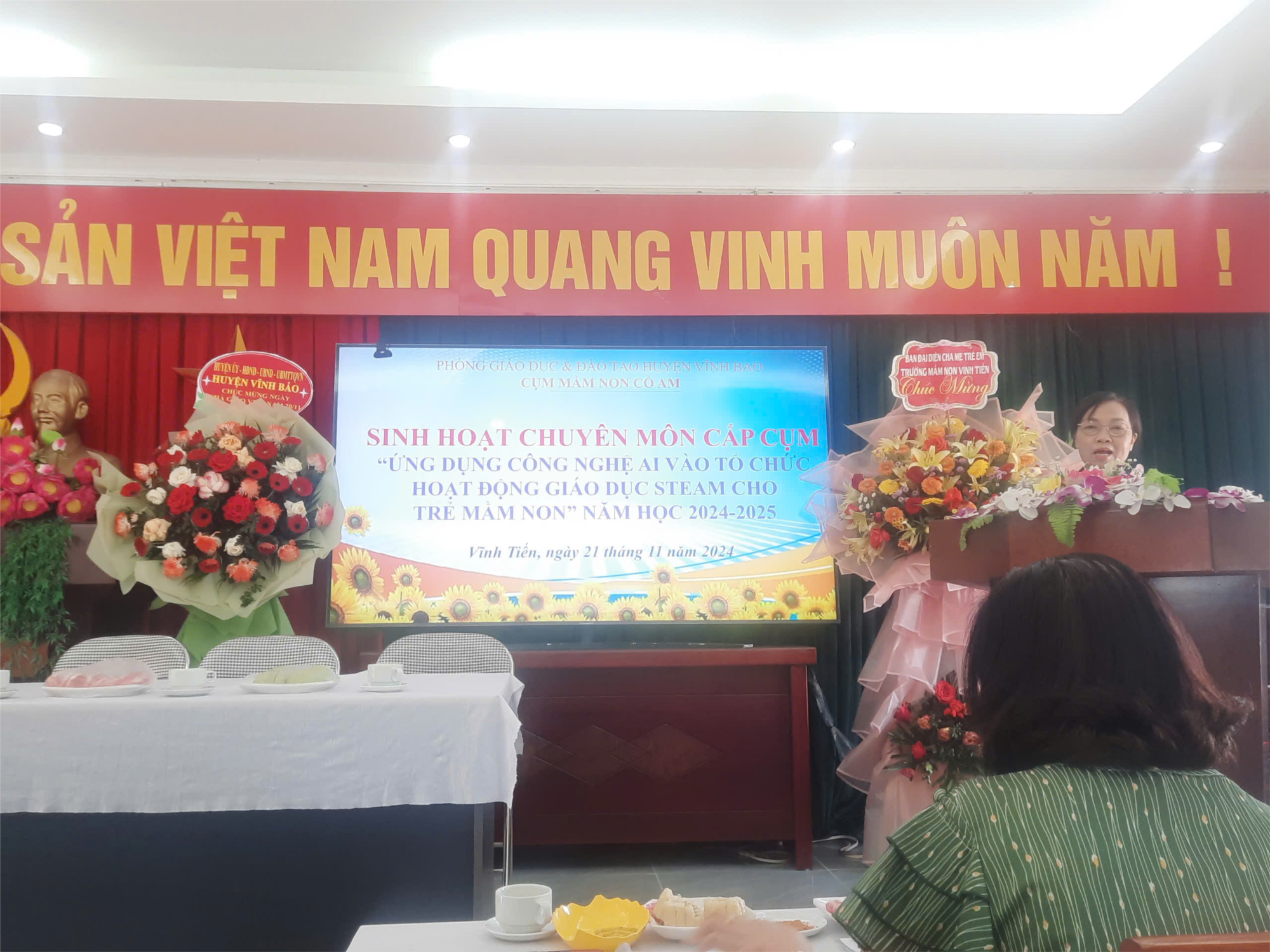 Thực hiện kế hoạch trong tâm năm học 2024- 2025 của PGD. Ngày 21/11/2024, cụm mầm non Cổ Am tổ chức sinh hoạt chuyên môn cấp cụm lần 1 tại trường mầm non Vĩnh Tiến. Chuyên đề "Ứng dụng công nghệ AI vào tổ chức HĐ GD STEAM cho trẻ MN". Về dự buổi SHCM có đ/c Phạm Thị Hoan- Phó trưởng phòng GD, đ/c Phạm Hữu Du- Chuyên viên PGD cùng các đ/c CBQL, GV cốt cán trường mầm non trong huyện VĨnh Bảo. Tham dự buổi sinh hoạt CM, các đ/c đã dự giờ 2 tiết dạy STEAM: