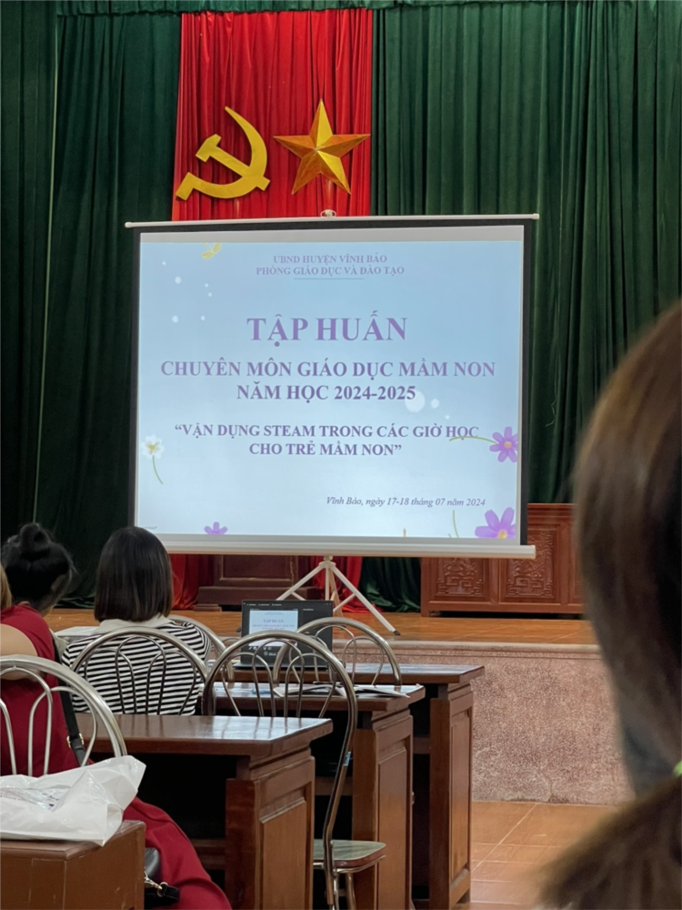 Ngày 17 và 18/07/2024. Phòng giáo dục đã tổ chức tập huấn chuyên môn cho CB và giáo viên cốt cán của các trường trong huyện. Nội dung chính của buổi tập huấn là ứng dụng STEAM trong giáo dục mầm non. Qua 2 ngày học tập, Hiệu phó PT chuyên môn và giáo viên cốt cán các trường đã được củng cố và bồi dưỡng thêm nhiều kiến thức về STEAM, các dự án STEAM và dự án học tập. Qua đó áp dụng trong xây dựng kế hoạch giáo dục của trường mình.
