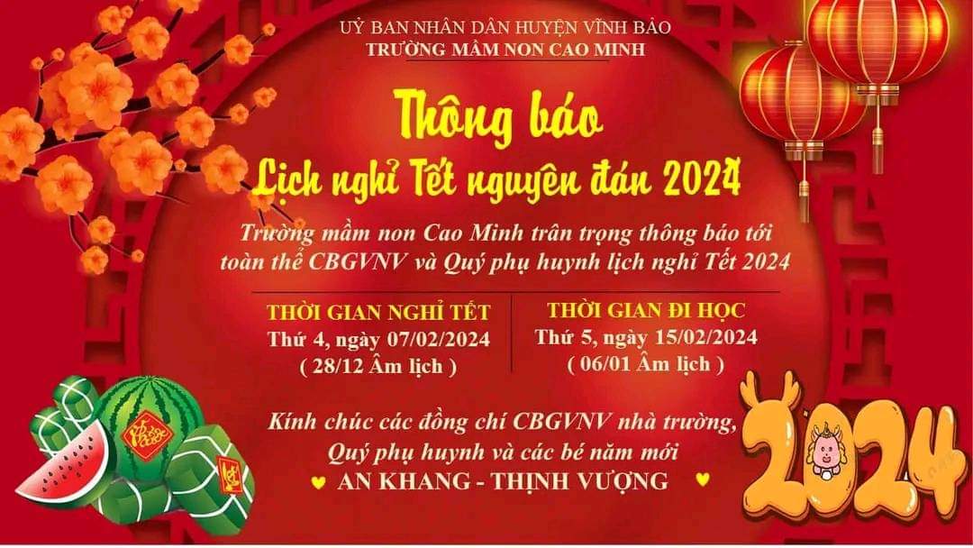 Trường mầm non Cao Minh kính gửi phụ huynh lịch nghỉ tết Nguyên Đán- Giáp thìn 2024