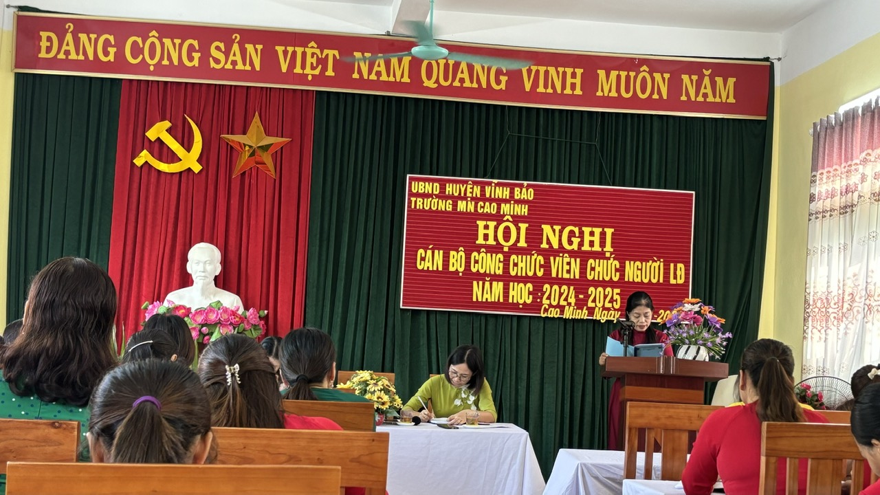 Thực hiện nhiệm vụ trọng tâm năm học 2024- 2025, thực hiện sự chỉ đạo của Phòng GDĐT huyện Vĩnh Bảo về các công tác đầu năm học. Ngày 5/10/2024. Chi bộ nhà trường kết hợp với công đoàn trường Mầm non cao Minh lọng trọng tổ chức hội nghị CB, VC- người lao động 2024- 2025. Về dự hội nghị có các đại biểu đại diện cho lãnh đạo địa phương và đại diện cha mẹ trẻ em cùng toàn thể CBGVNV nhà trường. Hội nghị đã diễn ra trong 1/2 ngày, đã thông qua các văn bản: